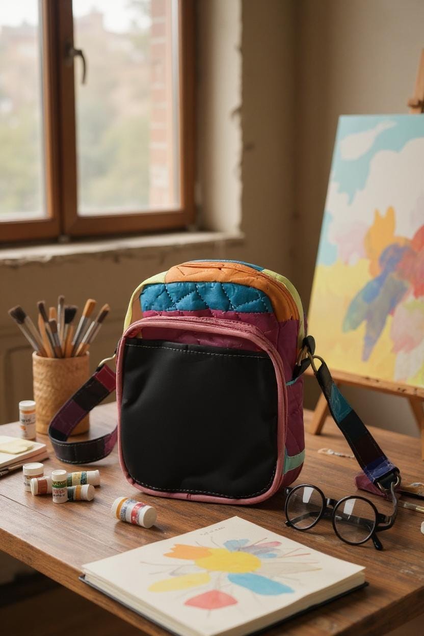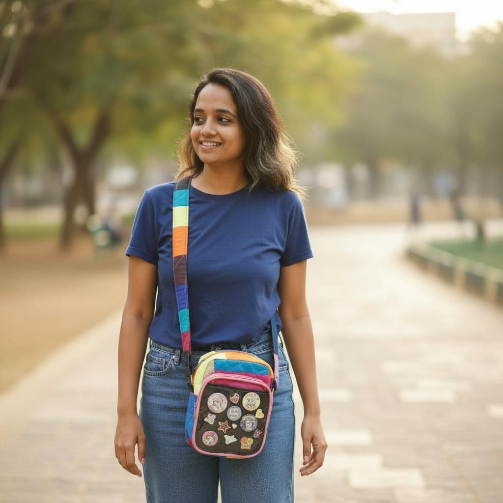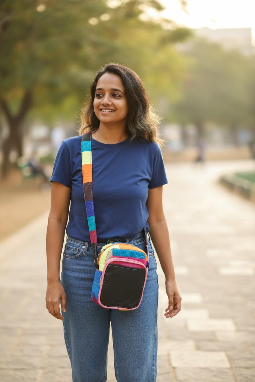 Multicolor solids pieces patchwork quilted to give you an Ita Cross body sling.